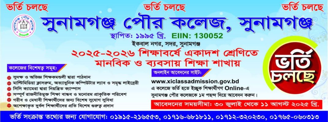 সুনামগঞ্জ পৌরকলেজ সুনামগঞ্জ জেলা শহরের একটি স্বনামধন্য ও সুপরিচিত শিক্ষা প্রতিষ্ঠান। ১৯৯৫ সালে কলেজটি প্রতিষ্ঠার পর থেকে সুনামগঞ্জ জেলার শিক্ষা বিস্তারে অনন্য ভূমিকা পালন করছে। আমরা কলেজটির সর্বোচ্চ সাফল্য অর্জনে অঙ্গীকারবদ্ধ।